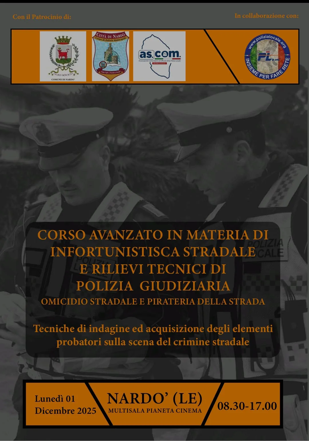 Il Comando di Polizia Locale di Nardò, in collaborazione con As.Com. (Associazione Comandanti ed Ufficiali della Polizia Locale di Lecce), organizza un corso di aggiornamento professionale in materia di infortunistica stradale e tecniche di polizia giudiziaria.