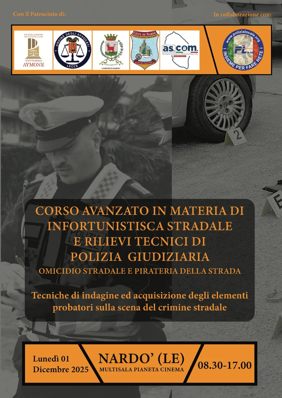 Il Comando di Polizia Locale di Nardò, in collaborazione con As.Com. (Associazione Comandanti ed Ufficiali della Polizia Locale di Lecce), organizza un corso di aggiornamento professionale in materia di infortunistica stradale e tecniche di polizia giudiziaria.