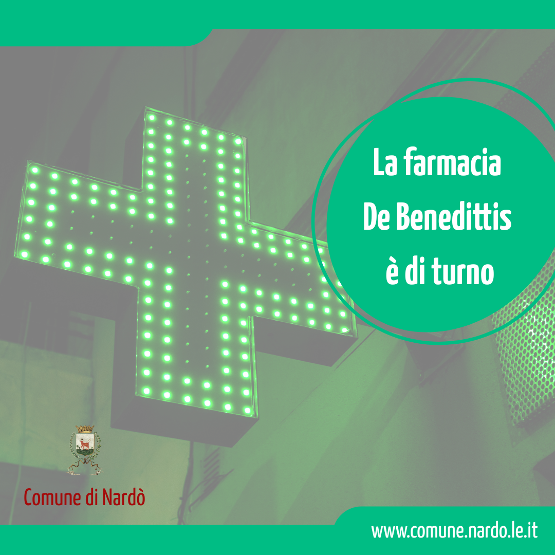 A partire da oggi, lunedì 29 settembre, e sino a domenica 5 ottobre, la Farmacia De Benedittis (via Raho, 35) farà il turno notturno e festivo (tel. 0833 873747). Inoltre, sabato 4 ottobre sarà aperta anche la Farmacia di Nardò (via Raho, 79).